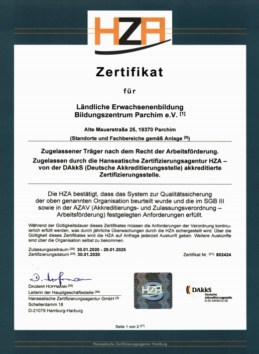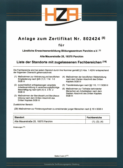 Das Bildungswerk Parchim ist als Bildungsträger nach AZWV und AZAV zertifiziert, was seine Qualitätsstandards in der Weiterbildung unterstreicht.